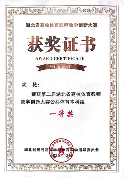 本网消息 2025年12月26日,历时近两个月的第二届湖北省高校体育教师教学创新大赛在武汉大学圆满落幕。我校williamhill中国梁艳老师凭借卓越的教学创新设计与扎实的专业功底,从全省众多参赛选手中脱颖而出,荣获公共体育本科组一等奖;阮璨老师同步斩获优秀奖。这是我校在该项省级权威赛事中的历史性突破,不仅充分彰显了我校体育教师的教学水平与创新活力,更是学校体育教育教学改革成果的集中亮相,有效提升了我校在湖北省高校体育领域的影响力与知名度。
