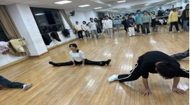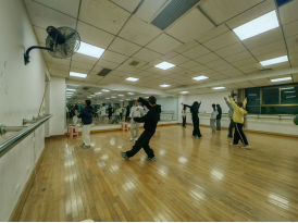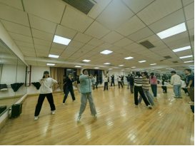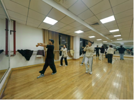 首先是基础热身训练和韧性考核,热身训练由校队成员教授参与选拔的同学热身动作,韧性考核主要看大家腿部的韧性,包括竖叉和横叉,这项考核主要是通过观察同学们的身体协调性和韧性来进行评分。