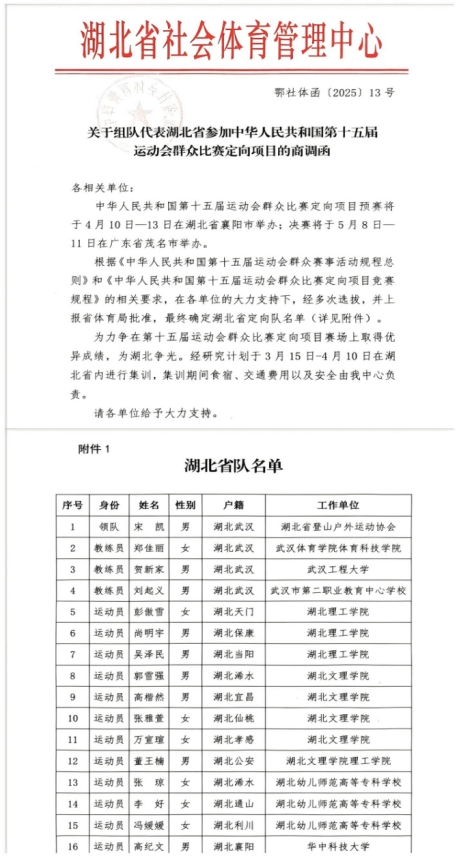 本网消息 近日,从湖北省社会体育管理中心传来喜讯,我校定向越野队三名队员(土建学院尚明宇和彭傲雪同学,以及刚毕业的原计算机学院吴泽民同学)凭借过硬的体能素质、扎实的定向运动技能和出色的赛事表现,成功入选2025年湖北省定向运动省队,积极备战第十五届全国运动会定向运动比赛。这是我校自成立定向运动队以来首次有学子跻身省级最高水平的队伍,标志着我校体育人才培养实现历史性突破,更是学校坚持以体育人、深耕特色体育项目结出的硕果。