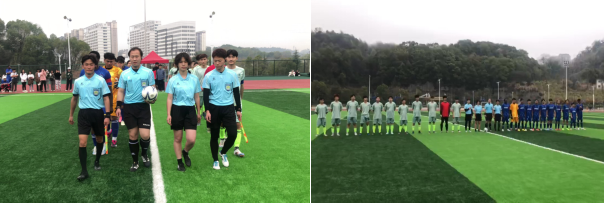 14时55分,国际足联公平竞赛曲响起,裁判员与双方运动员纵队入场,并面向国旗行注目礼,高唱国歌。15时整,主裁判汪詹涵一声哨响,比赛正式开始。双方运动员在绿茵场上积极拼抢,激烈对抗,你来我往,找准时机直切对方漏洞,形成一次次精彩的进攻。运动员们用绝妙进球回应着场下观众的高声呼喊,成为了绿茵场上的最美丽的风景;丢球一方也毫不气馁,重振旗鼓,冷静控球,继续创造进攻机会;裁判员团队紧跟比赛的发展,及时判罚,维持了比赛的秩序。随着主裁判汪詹涵的三声长哨响起,赛果既定,国际学院以3:0的比分战胜了机电学院,取得本赛季的开门红。比赛有胜负,但双方尊重对手,顽强拼搏和不言放弃的精神给彼此留下了深刻印象,同时增进了学院间的交流和友谊,有效提升了大家的协作理念和团队意识。